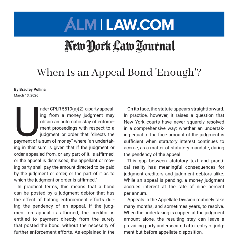 This article explores a critical but unresolved issue in New York appellate practice: whether an appeal bond equal to the face value of a judgment is sufficient when statutory interest continues to accrue during the appeal. Bradley Pollina examines the gap between the statutory language of the CPLR and the practical realities faced by litigants, highlighting how courts have addressed this tension and what it means for both judgment creditors and debtors.